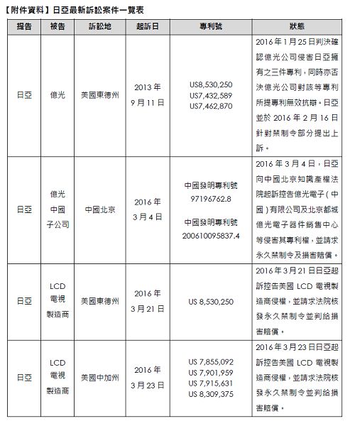 日亞化于上周來臺與媒體餐敘中公布數(shù)個LED專利的侵權(quán)告訴,涵括兩個在美國德州地區(qū)法院控告電視制造商Vizio的告訴以及在加州對億光提出的YAG專利侵權(quán)告訴。