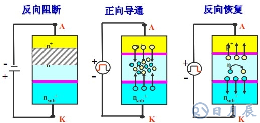 然而,肖特基二極管的正向通態(tài)損耗與電壓范圍及外延層的厚度密切相關(guān),所以硅基的肖特基二極管并不適用于工作電壓超過(guò)200V的場(chǎng)合。它和普通的PIN二極管相比由于缺少P區(qū),所以也無(wú)法通過(guò)電導(dǎo)調(diào)制效應(yīng)減少導(dǎo)通電阻。盡管普通二極管的“慣性”較大,但是在超過(guò)200V的工作電壓場(chǎng)合,普通的PIN二極管占主導(dǎo)地位。